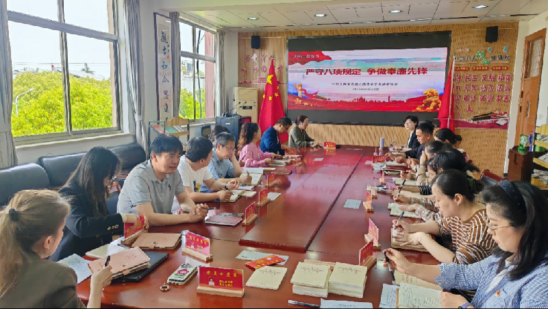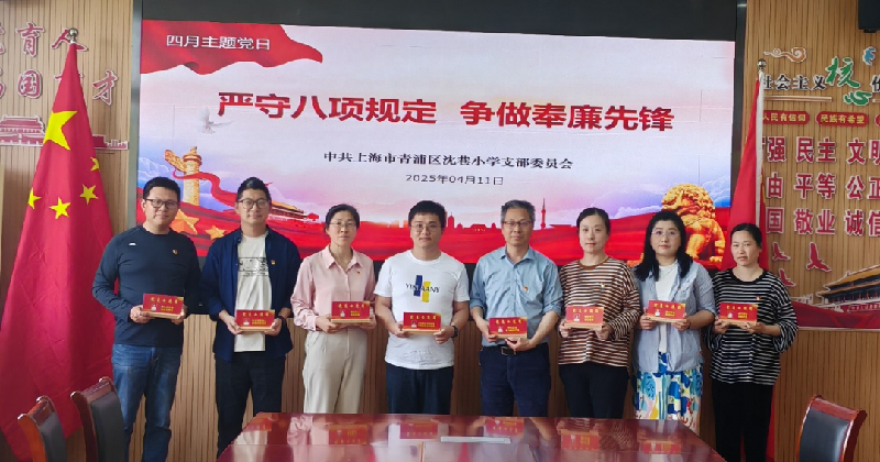2025年4月11日上午,青浦区沈巷小学党支部在上善楼党员活动室组织开展四月份主题党日活动。本次活动主题为“严守八项规定 争做奉廉先锋”,出席对象为全体党员同志,活动由党支部副书记吴燕文主持。
